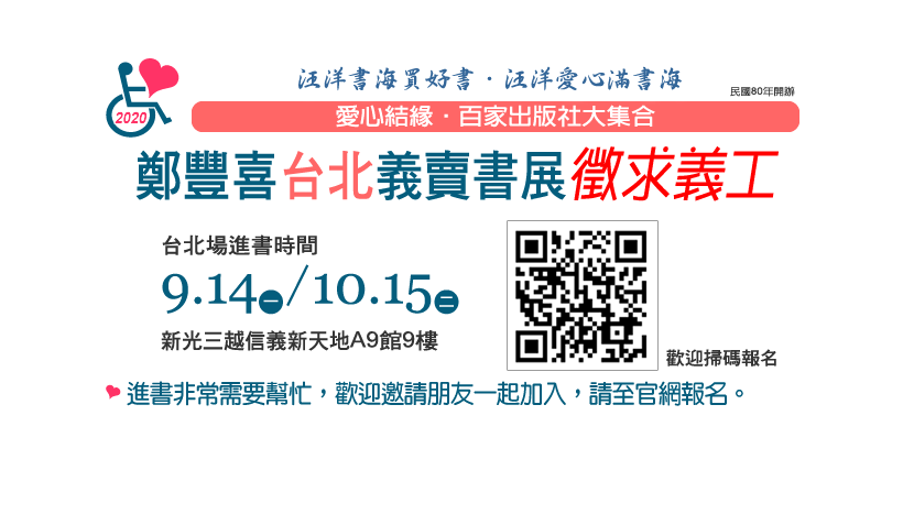 109台北義賣書展–徵求義工 好友們: 鄭豐喜台北書展將於9/16(三)開展了,非常令人期待! 書展前有一項艱鉅的任務就是進場佈展!非常需要好友幫忙,或請好友幫忙問問是否有朋友能來書展盡一份力量。 請至官網報名,收到報名訊息我們會盡快與您聯絡,非常感謝好友的愛心,期待台北義賣書展 https://www.cfh.org.tw/?page_id=3558 回應: