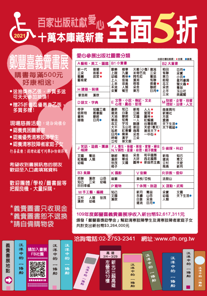2021鄭豐喜【全面五折義賣書展】台北場2/4開展 2021鄭豐喜【全面五折義賣書展】台北場於2/4至2/22開展,邀請百家出版社一起幫助肢障朋友籌募愛心公益基金,是鄭豐喜基金會-大學.研究所優秀肢障學生&重度肢障者家庭子女奬學金來源。歡迎好友來書展尋寶,也請好友們幫忙宣傳喔,謝謝! 2021台北五折義賣書展展出:2/4(四)~2/22(一) 會場:新光三越台北信義新天地A9館9樓地點:台北市信義區松壽路9號時間:例假日前一天11:00~22:00/平日11:00~21:30 回應: