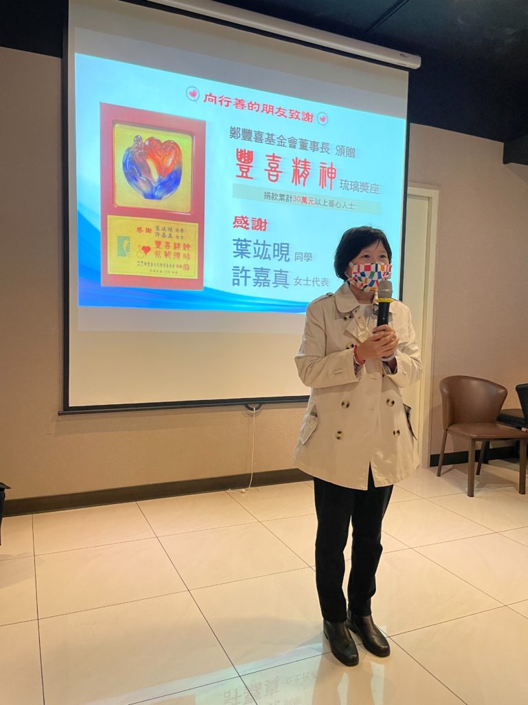 今年基金會接到一個電話,稱是以前申請獎學金葉同學的母親,要捐款給基金會。因是大額捐款在詳細了解之下才知葉同學已往生,真讓人傷心不已…葉媽媽感謝鄭豐喜基金會對肢障學生的用心,以葉同學的名義捐款給基金會,表揚典禮邀請葉媽媽參加並頒贈「豐喜精神 永範德昭」琉璃獎座,感恩葉媽媽的大愛。