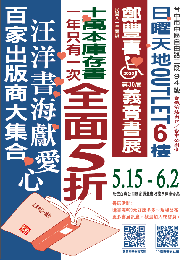 台中場「鄭豐喜義賣書展」將於5/15在日曜天地OUTLET 6樓開展!歡迎好友來書展支持基金會~買書做公益,感謝