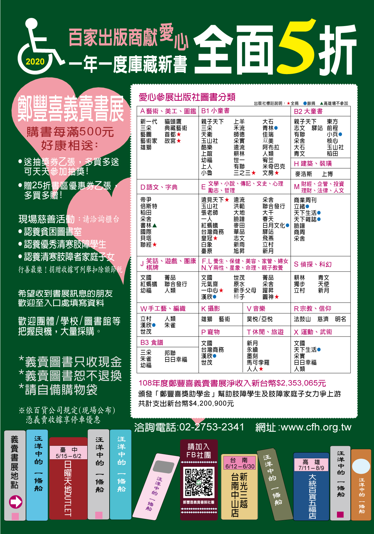 109年度鄭豐喜義賣書展-參展出版社 感謝好友來訊詢問今年參展的出版商,抱歉讓大家久等了,因今年環境特殊,一直到這兩日才完全確認~感謝參展出版社在這樣的時局能一起為公益奉獻愛心。「台中五折義賣書展」5/15將在日曜天地OUTLET 6樓舉辦,日曜天地OUTLET和基金會及百大出版商歡迎好友一起來支持義賣書展,謝謝。【台中五折義賣書展】展出:5/15(五)~6/2(二)會場:日曜天地OUTLET 6樓地址:台中市中區自由路二段94號6樓 (台中公園對面)時間:依百貨公司規定 回應: