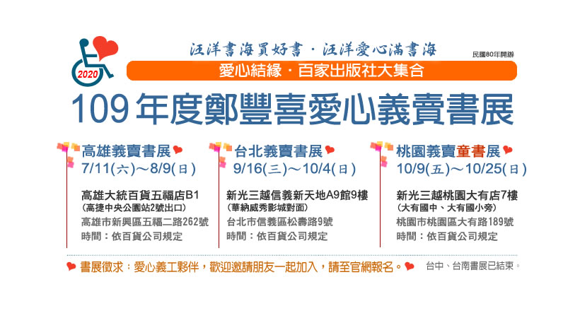 在執行長與各百貨公司多次洽談後,109年度「鄭豐喜愛心五折義賣書展」已經全部確認場次。